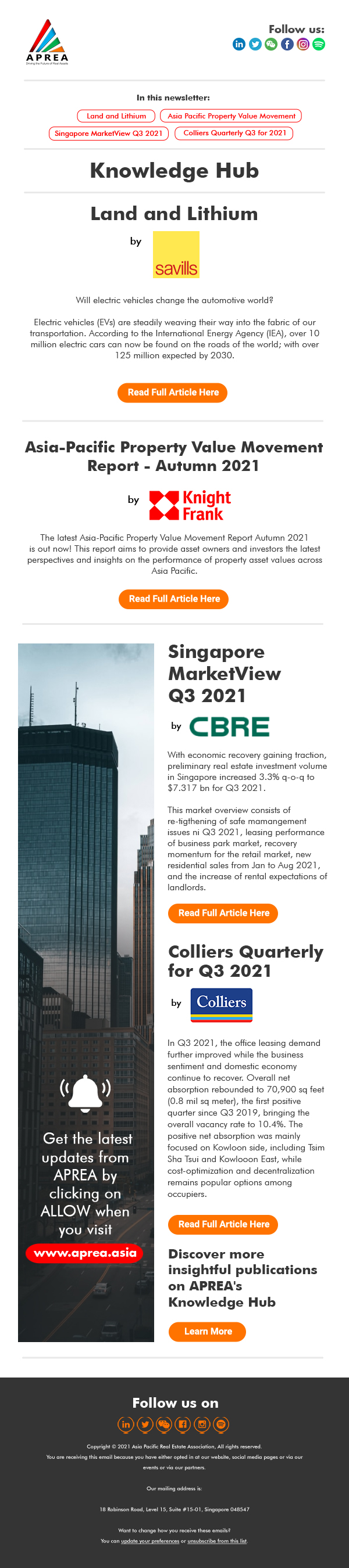 Knowledge Hub: ● Land and Lithium ● Asia-Pacific Property Value Movement Report ● Singapore MarketView ● Colliers Quarterly for Q3 ●